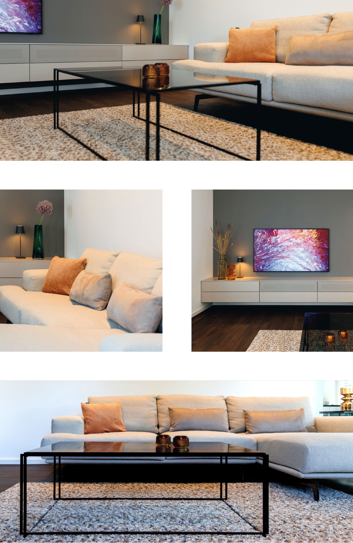 Das maßgefertigte Sideboard und das elegante Highboard bieten nicht nur großzügigen Stauraum, sondern fügen sich dank ihrer klaren Linien und hochwertigen Verarbeitung nahtlos in das Gesamtbild ein. Ein Teppich in abgestimmten Grautönen sorgt für zusätzliche Gemütlichkeit und verbindet die einzelnen Möbelstücke zu einem harmonischen Ensemble.