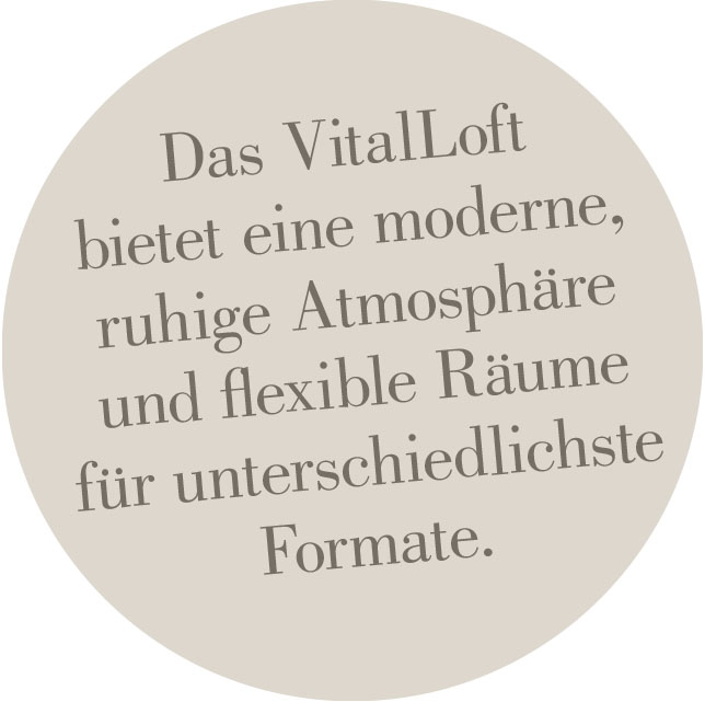 Eine moderne, stilvolle Atmosphäre, klare Linien und wohltuende Ruhe: Das VitalLoft ist ein besonderer Ort, an dem unterschiedlichste Formate Raum finden – von Workshops über Teamevents, unsere Impuls-Seminarreihe für Führungskräfte bis hin zu Klangschalenmeditationen. Die Räume können flexibel angemietet werden und bieten die ideale Umgebung, um in einer inspirierenden Atmosphäre wirksam an sich selbst zu arbeiten.