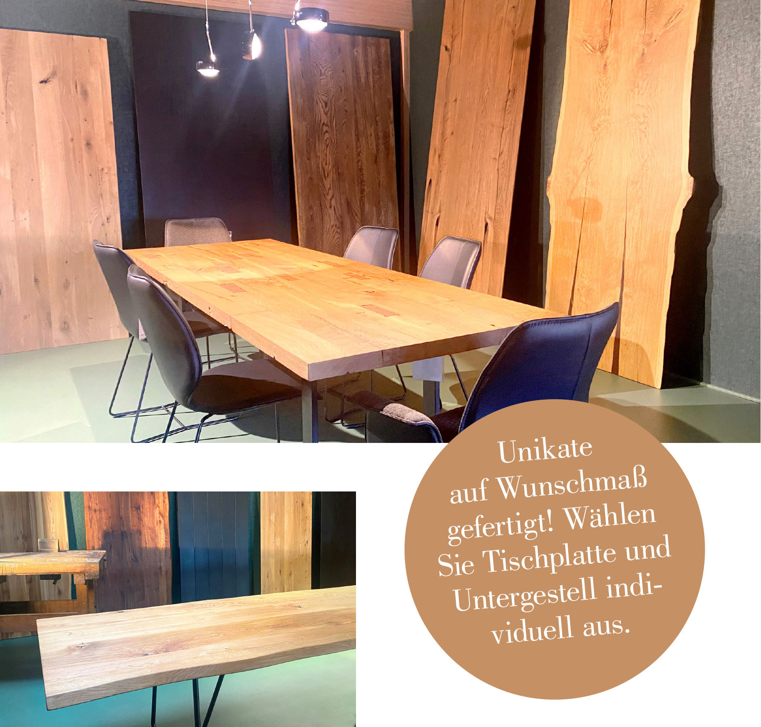 Entdecken Sie Tische mit hoher Strapazierfähigkeit, natürlicher Oberfläche und einzigartigem Design und stellen Sie sich Tischplatte und Untergestell ganz individuell in Größe, Form und Optik zusammen.